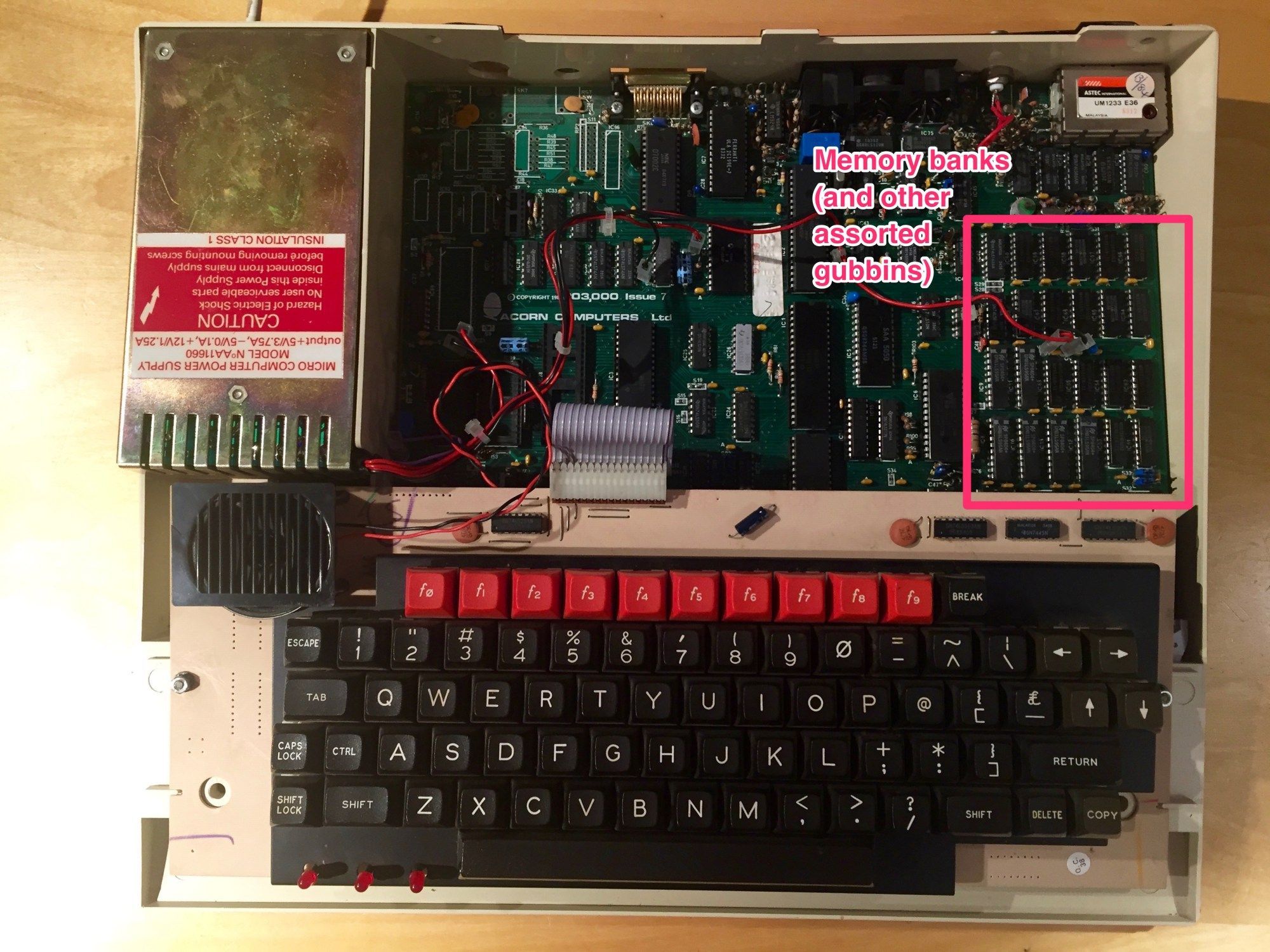 First, a little more insight into how BBC memory is organised. On a 32K Model B, there are two banks of memory called CAS0 and CAS1 (Column Address Strobe, since you ask). Each bank has a group of 8 chips, each one responsible for one bit of each byte the computer needs to store, up to 16k per bank. So, Model As have one bank, CAS1 (16k), and a B has CAS0 & CAS1 (32k).