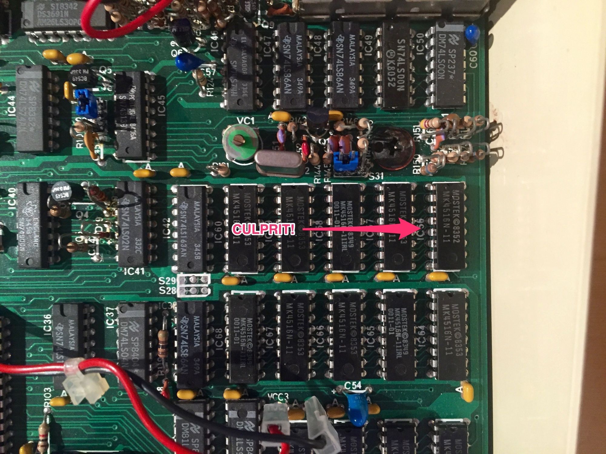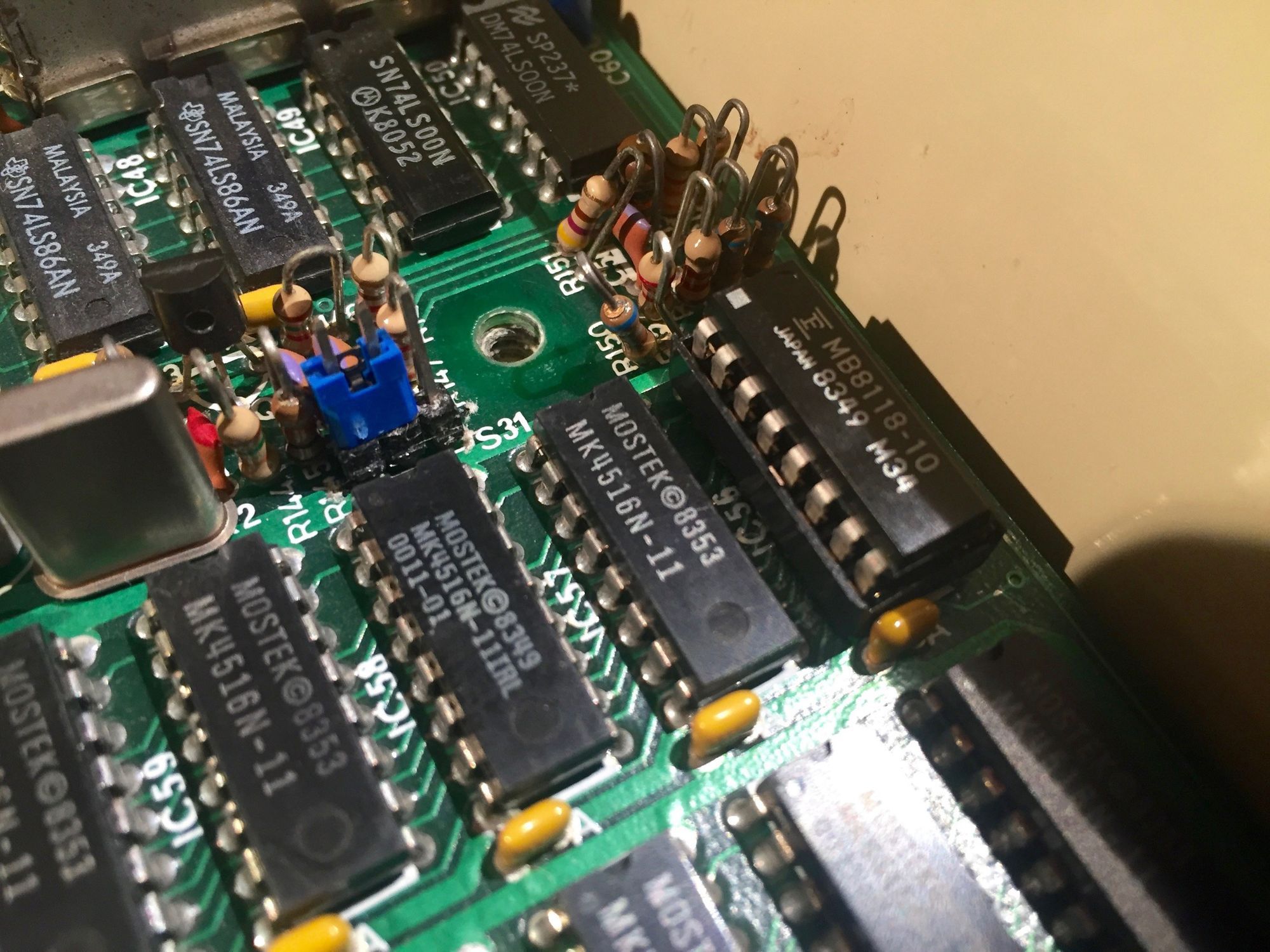 Having procured some pin-equivalent memory chips from eBay (MB8118-10), I set about de-soldering IC56 and replacing it with a socket. This is not a job for the faint-hearted. Even with years of soldering experience, I struggled to get the old chip out without damaging the PCB.