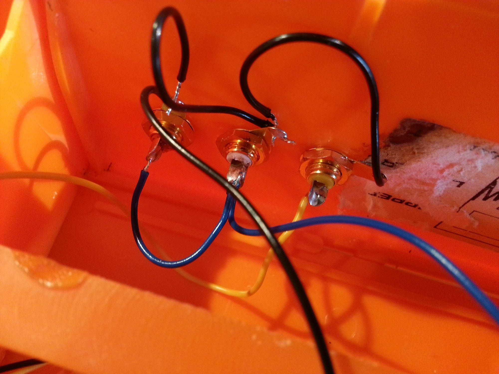 Carefully installing the stripboard, I soldered the phono plugs in (which was a real pain) and reassembled the unit. Audio requires nothing special, just connection to a phono plug and the ground.