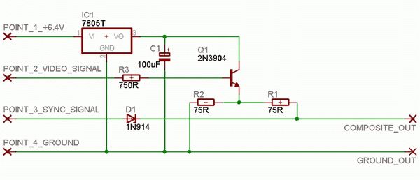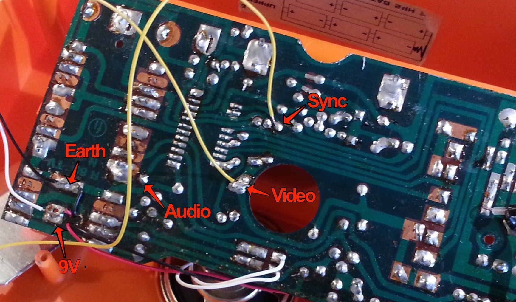 We’ll find a point on the board where the signals are combined and tap off it. Also, we can get a feed from the 9V power and ground. However, as composite standard is 5V, we’ll need to step down the voltage accordingly. We can also get the audio output from the unit (it normally uses a built-in speaker) and create outputs for that as well.