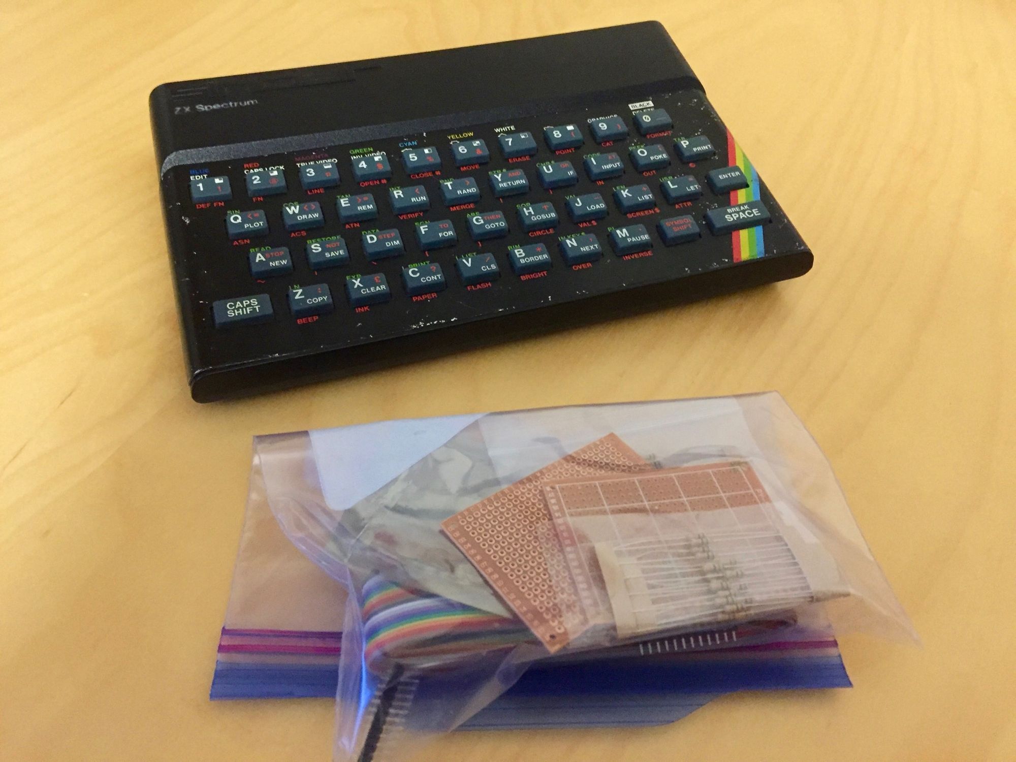 Not being one to re-invent the wheel, I’d been reading over this Instructable wot I found and occasionally drooling over the excellent kits offered by Tynemouth Software. Then, a battered old Speccy case and the parts needed for a USB interface found their way onto a Facebook group for just £20, their current owner being caught between retro-project-awesomeness and ‘having a life’ and ‘friends’. Clearly making the wrong choice, he put them up for sale.