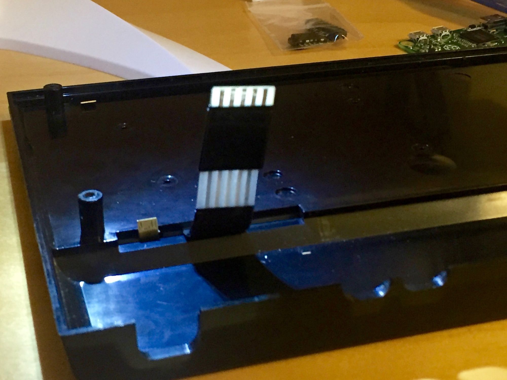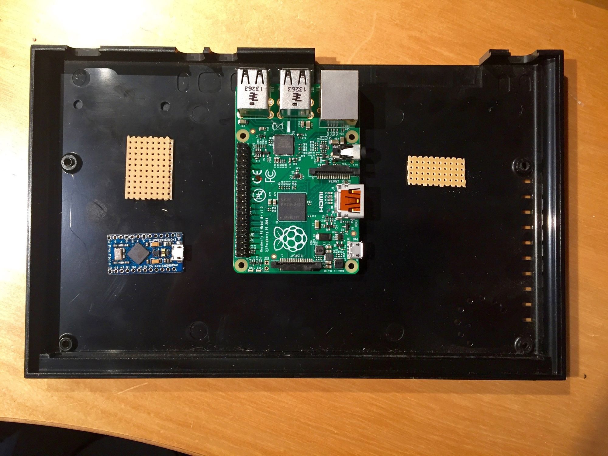 Originally I’d thought the Pi (a model B+) wasn’t going to fit with its tall USB ports. Thankfully it does so in the upper raised area of the case, albeit placing some annoying restrictions on where it can be placed.