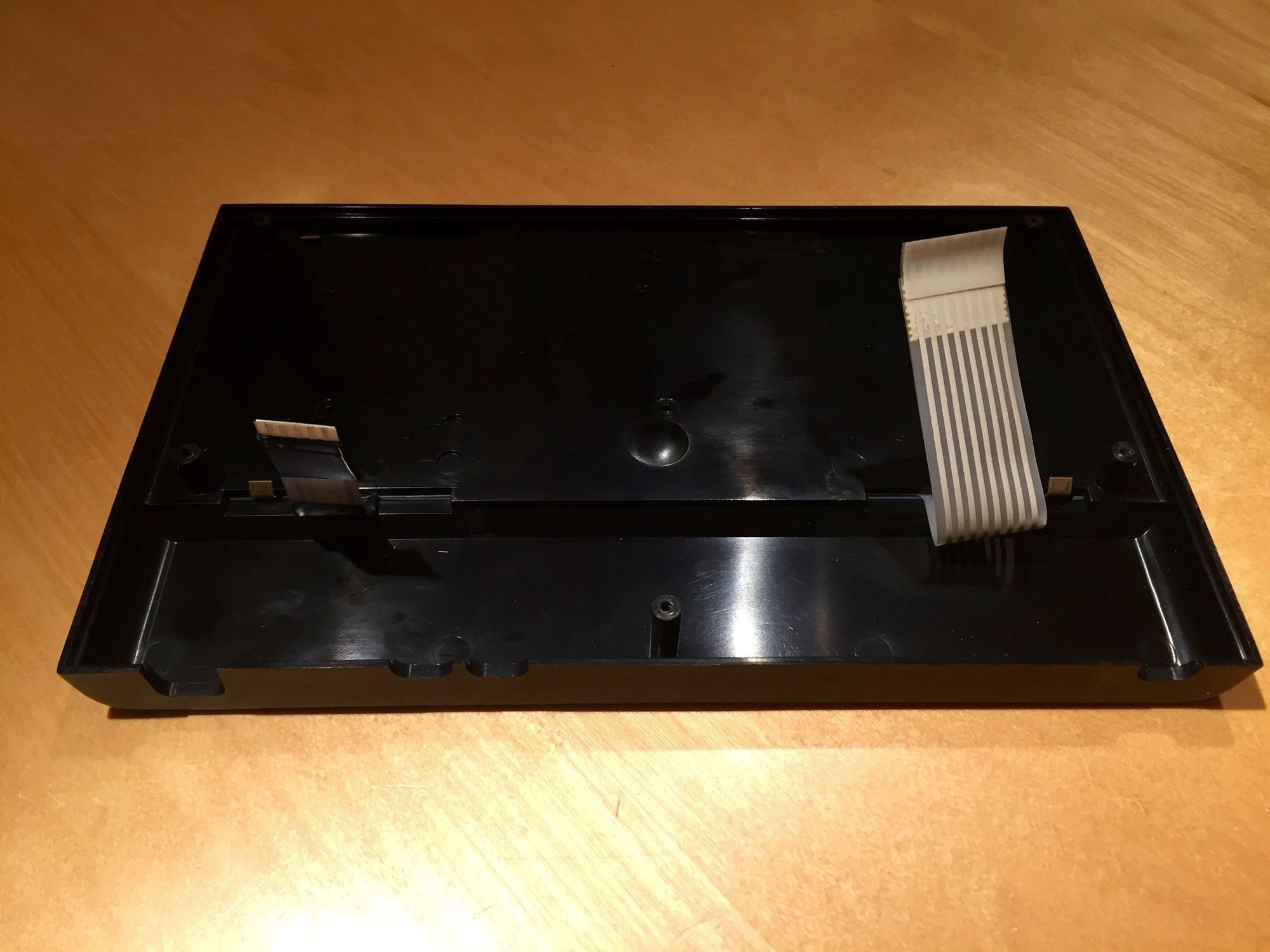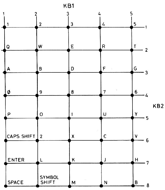 The Speccy’s keyboard uses a thin plastic membrane sandwich with two layers of electrical tracks which form a matrix grid of 5 by 8 tracks. When a key is pressed it creates a circuit between two of these tracks that are connected to the motherboard. Each key ‘lights up’ a unique pair of tracks. The tracks lead into two ribbon cables that go from the keyboard assembly to the motherboard. These are known as the ‘data’ and ‘address’ cables and only one wire on each will light up per keypress. The ribbon itself is very, very delicate and normally the first thing to fail on a Speccy, causing any keys on the broken line to fail. Newly manufactured replacements are available that are a lot more sturdy should they be needed.