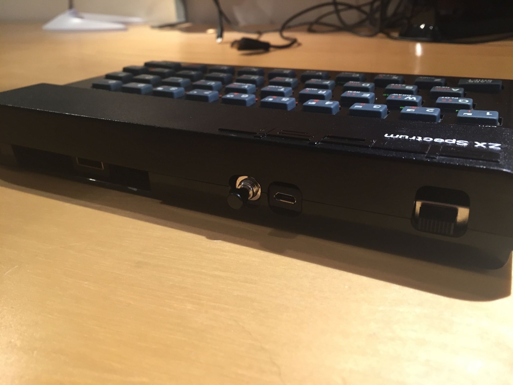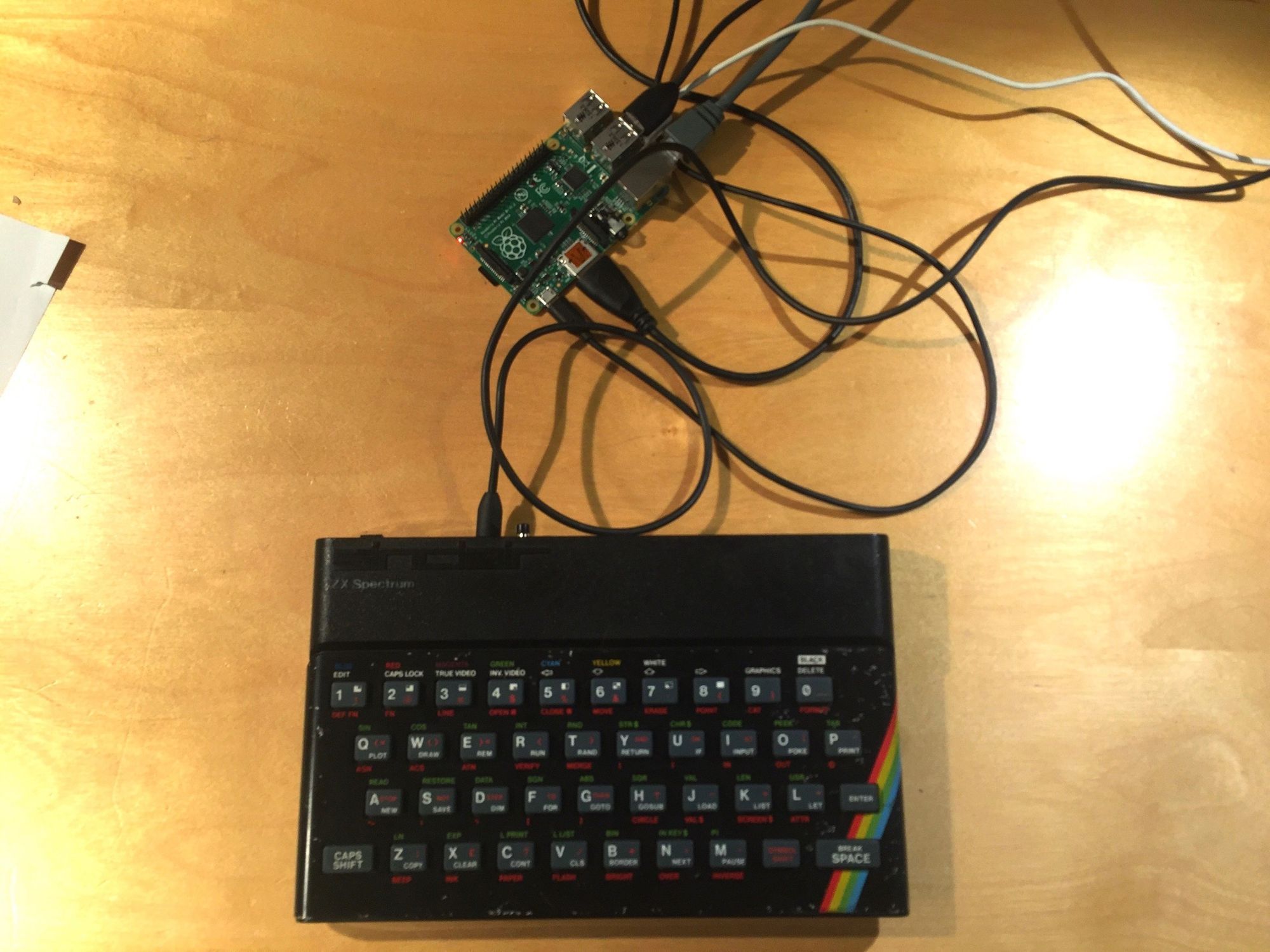 Brandishing my glue gun, I put the USB mode switch and external connector in place then hooked them up the Pro Micro. The Raspberry Pi could be stuck into place (using less-permanent sticky pads) being careful to ensure the USB and Ethernet headers would fit in the raised part of the ZX Spectrum’s top cover. I inserted the delicate USB plug into the PI along with a WiFi adaptor (although I built the system up connected directly by Ethernet). Then the power feed from the external USB was hooked up to the Pi.