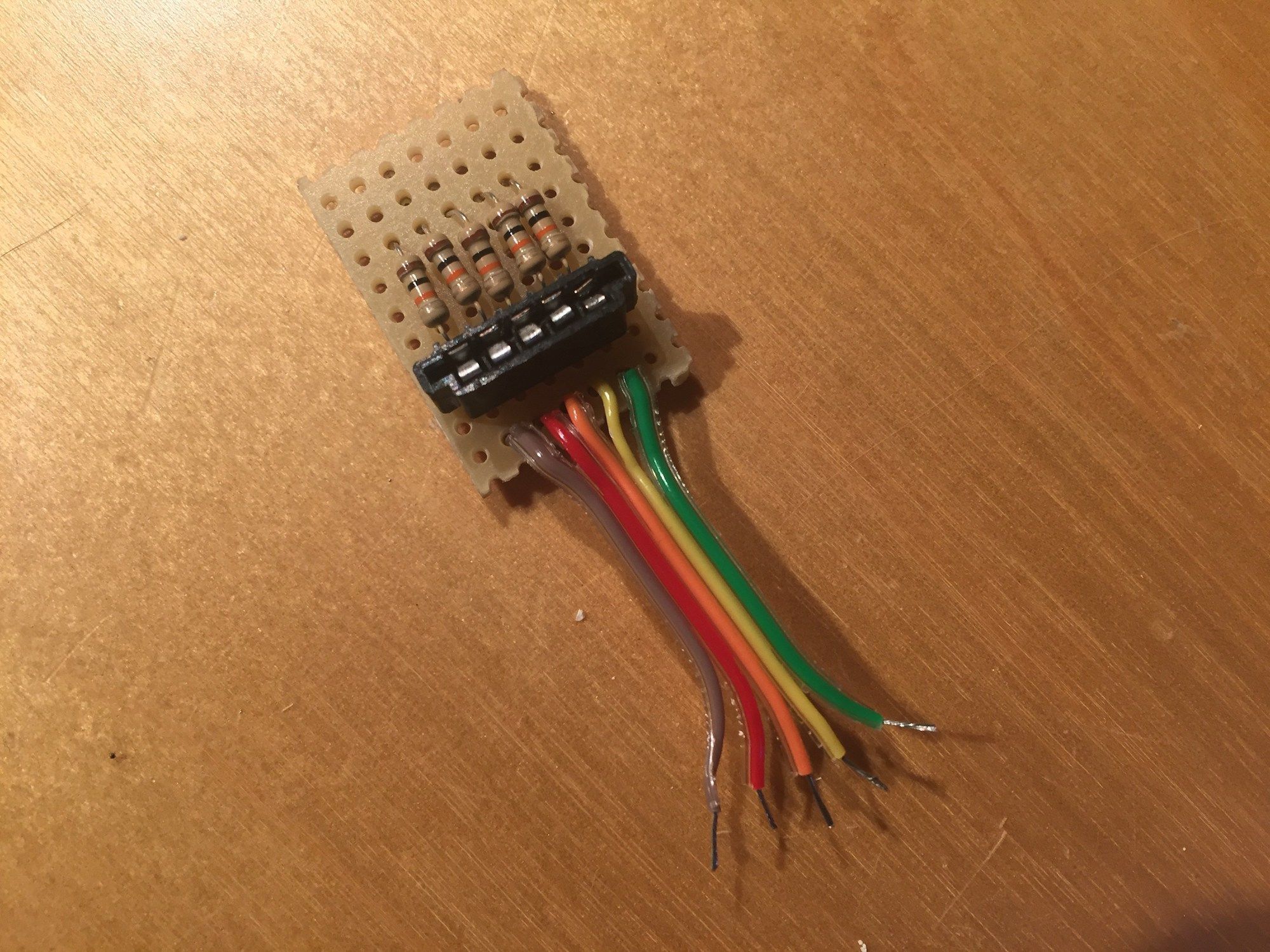 I need to connect all 13 lines from the Speccy’s membrane to the microcontroller so it can read them. This will be done by outputting current on the address lines (the group of 8 or KB2) and reading the results on the data lines (the group of 5, KB1). Due to a problem with reading currents known as floating, I need to use pull-up resistors on the data lines. This has been taken from the original Instructables article but since them I’ve realised that the Pro Micro may well have built-in pull-up resistors on the chip as the Arduino Uno does. In other words, this might not have been a necessary step. Still, won’t hurt. Update: I was correct, see Part 4.