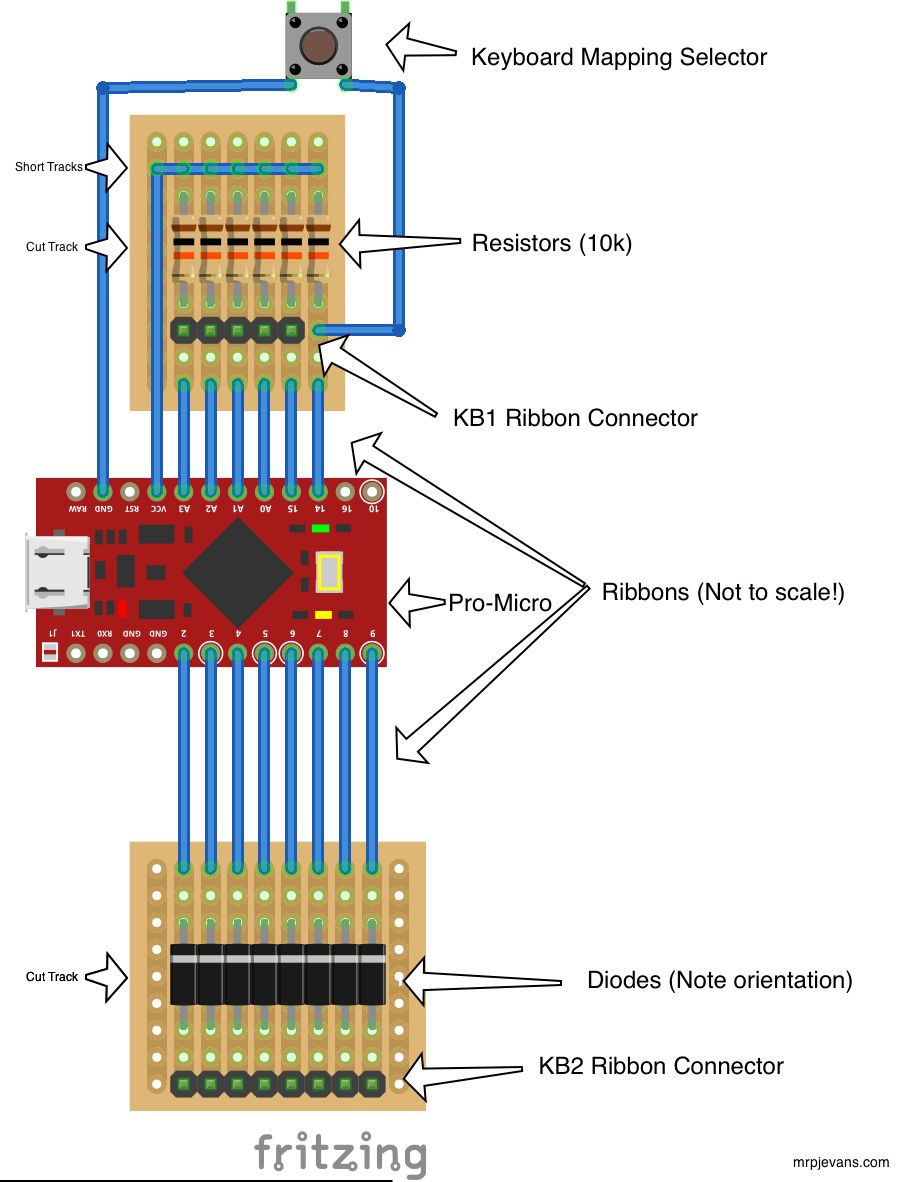 5V from the Pro Micro is sent to the resistors and then back into the inputs. So, everything initially registers as high current. The KB1 membrane ribbon is also connected to the stripboard. If it connects with a line on KB2, i.e. a button is pressed, it will draw the current to the address line and the data pin will read low. A key has been pressed. Our controller will scan each data line on each address line to detect keypresses. A scan of 40 combinations in all (8 x 5). Even this cheap piece of hardware will be able to do this several thousand times a second.